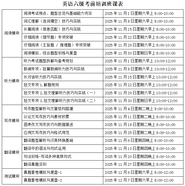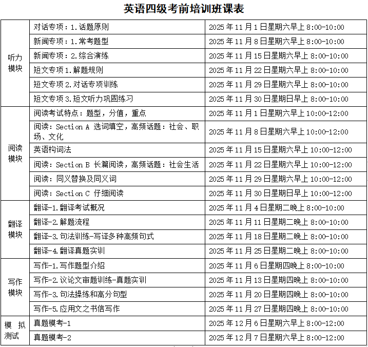 英语作为国际交流的重要工具,在教育和职业发展中扮演着越来越重要的角色。大学英语四、六级考试(CET-4/6)不仅是衡量大学生英语水平的重要标准,也是许多企事业单位招聘时参考的重要指标之一。 为帮助广大学生顺利通过大学英语四、六级考试,提升英语综合应用能力,开云网页版登录入口特别推出“大学英语四、六级考前培训班”。该项目旨在为应考学生提供系统化、个性化的学习方案,为顺利通过考试助力。 【培训目标】 帮助学员掌握大学英语四、六级考试的核心知识点和解题技巧。 提升学员在听力、阅读、写作及翻译等各方面的应试能力。 助力学员备考大学英语四、六级,取得理想成绩。 【培训内容】 听力专项:强化训练,习得技巧,提升分数 阅读专项:打破传统,掌握方法,争取高分 写作专项:活用模板,巧用句型,优化结构 翻译专项:逻辑转换,转变思维,着重产出 测试点评:全真试题,定位短板,科学提升 【培训对象】 1.广西大学在读本科生和研究生; 2.南宁市内高校在读本专科生和研究生。 【培训方式】 线上线下混合教学:线上平台提供丰富的教学资源,方便学员随时复习和练习重点知识;线下课堂开展面授教学,包括知识点讲解、小组讨论、课堂练习等。 小班教学:每班学员控制在30人左右,确保教师能够关注到每位学员的学习情况,提供个性化指导。 【培训时间】 培训周期为5周,共48个课时,每次课50分钟。课程主要安排在周末及课余时间。计划2025年11月1日开课,12月7日结课。 【收费标准】 大学英语四级考前培训班:1580元/人/期。 大学英语六级考前培训班:1880元/人/期。 【联系方式】 咨询报名热线:0771-3235605 李老师 报名地址:开云网页版登录入口210办公室 咨询二维码 报名二维码