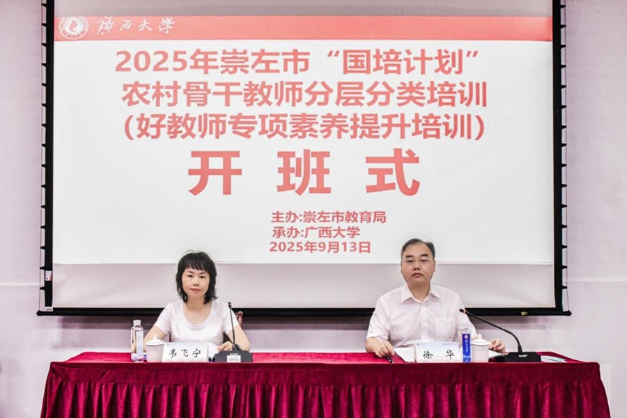 为深入贯彻落实国家关于新时代教师队伍建设改革的决策部署,提升崇左市教育系统教师的专业能力与综合素养,9月13日,由崇左市教育局统筹、广西大学承办的2025年崇左市“国培计划”农村骨干教师分层分类培训班(好教师专项素养提升培训班)在我校开班。开云网页版登录入口副院长徐华出席开班式并讲话,开云网页版登录入口副教授范小俊主持开班式。