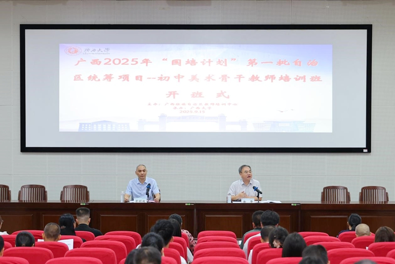 “国培计划”是落实《教育强国建设规划纲要(2024—2035年)》的重大实践。由广西壮族自治区教师培训中心主办,广西大学承办的广西2025年“国培计划”第一批自治区统筹项目--初中美术骨干教师培训班于9月15日在广西大学开班,开云网页版登录入口副院长徐华出席开班式并讲话,开云网页版登录入口副教授彭剑波主持开班式。